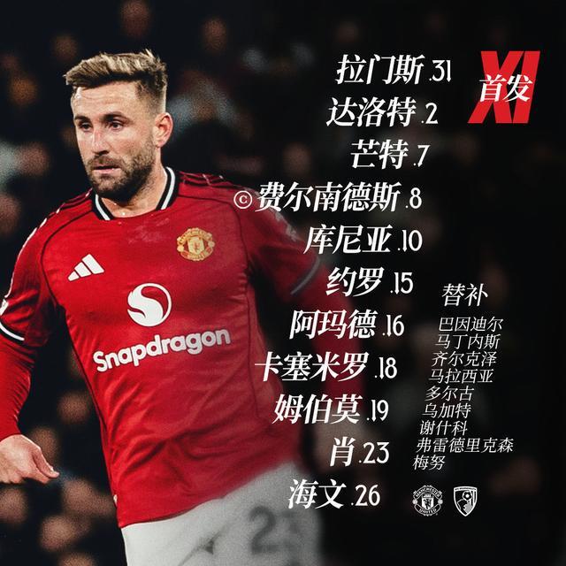 面对正处中下游的樱桃军团,阿莫林派上了库尼亚单箭头,身后是姆伯莫和芒特。后防线有所轮换,约罗、艾登-海文和卢克-肖搭档三中卫,为这场比赛的抽象埋下了伏笔!