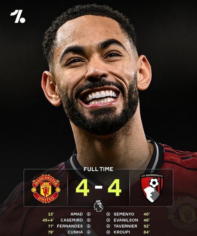 第84分钟,曼联后场被断,伯恩茅斯反击,克鲁皮推射破门,4-4!