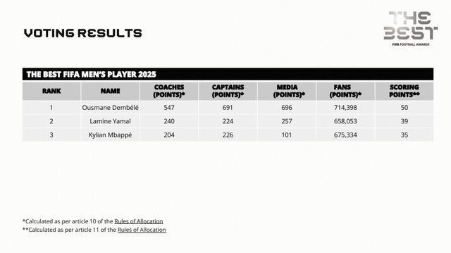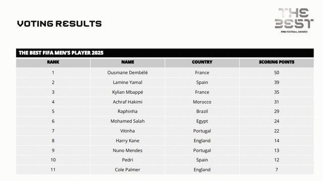 在2025年度最佳颁奖典礼结束之后,国际足联正式公布了男足年度最佳球员的排名以及得分详情。
