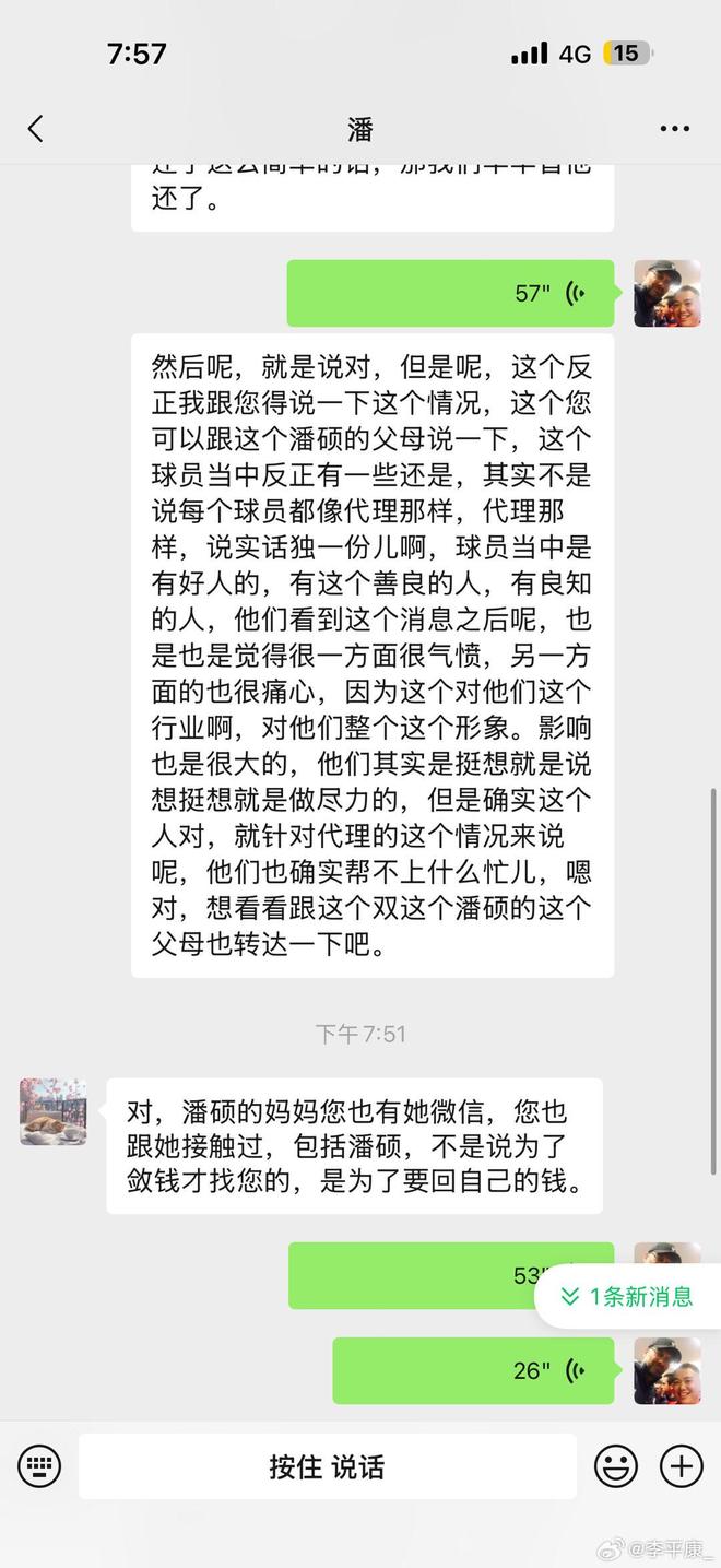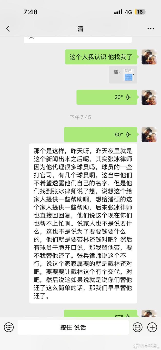 李平康写道:“昨天晚上潘硕去世的消息传出后,有几个球员联系到张冰律师和我,这其中基本都是张律的代理客户,有著名国脚也有自己还被欠薪的小孩。他们询问潘硕家人目前的需要,希望能够匿名为潘硕家人提供经济上的帮助,我们也解释了由于潘硕已经离世,潘家人并不想要捐款,只想要戴琳还钱,在这点上他们确实帮不上忙。还有球员说戴琳差多少钱他来还,这个张律也解释了,冤有头债有主,人家需要的是戴琳还,如果谁还都行我们早就补上了!在这里讲出这个事一方面是想说潘家并没有想借舆论来争取利益的想法,他们只想讨个公道给潘硕一个交代。另一方面就是这件事本身给中国的球员群体带来了巨大的负面影响,各个社媒充斥着针对整个球员群体的批判。但事实上每个领域都有好人坏人,中国足球圈也存在很多的正能量!”