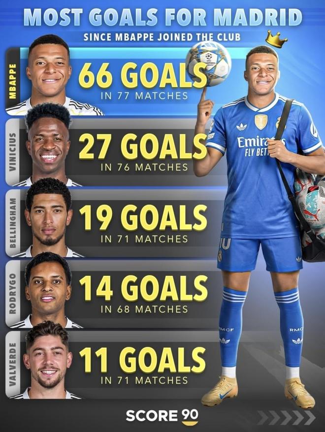 从皇马内部横向看,自姆巴佩加盟以来,77场66球、场均0.86,几乎把其他进攻点甩开一大截。维尼修斯76场27球、场均0.36,贝林厄姆71场19球、场均0.27,罗德里戈和巴尔韦德更低。数据直接体现出皇马进球重心高度集中在姆巴佩身上,他是绝对第一终结点,其余人更多承担拉扯、防守和辅助进攻的任务。