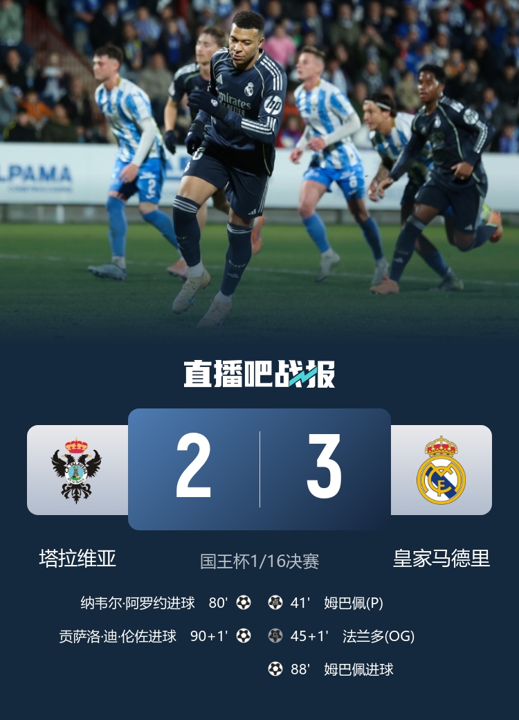 各项赛事两连胜!皇马3-2塔拉维亚晋级16强 姆巴佩双响+造乌龙