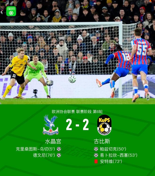北京时间12月19日英超日报,欧洲协会联赛联赛阶段第6轮展开较量,水晶宫与古比斯展开激烈对决。比赛伊始,德文尼送出助攻,克里桑图斯-乌切成功破门,为球队先拔头筹。随后,古比斯由萨瓦莱宁助攻帕兹切克完成进球,将比分扳平。不久后,安特维助攻易卜拉欣-西塞再入一球,古比斯实现反超。比赛进行中,安特维因犯规被红牌罚下,场上局势发生变化。此后,米切尔送出助攻,德文尼抓住机会破门得分,帮助球队最终将比分定格。全场结束,双方以2比2握手言和。