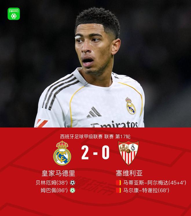 北京时间12月21日西甲日报西班牙足球甲级联赛 联赛 第17轮,皇家马德里主场对阵塞维利亚。上半场,罗德里戈开出任意球,贝林厄姆头槌破门。下半场,特谢拉放倒贝林厄姆吃到第二张黄牌被罚下。罗德里戈造点,姆巴佩主罚命中。全场比赛结束,皇马2-0战胜塞维利亚。