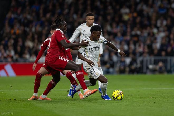 第24分钟,皇马右侧角球机会,赫伊森小禁区前沿获得不错机会,只是他头槌攻门顶高了。第38分钟,皇马获得前场右侧45度角任意球机会,罗德里戈操刀主罚斜吊门前,贝林厄姆小禁区前沿挤开多人包夹高高跃起回头望月甩头攻门,皮球应声入网,皇马1:0首开纪录。易边再战皇马还是稳稳占据场上优势,第58分钟,皇马前场围攻,姆巴佩禁区左侧抢点头槌攻门,BOOM的一声皮球被门柱挡了出来。