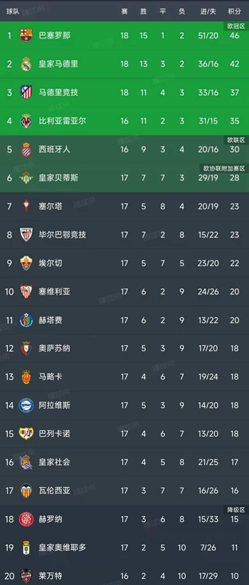 北京时间12月22日西甲日报,西甲第17轮结束了9场比赛,最新积分榜如下!