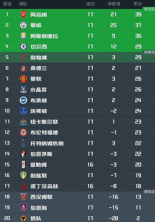 目前,英超积分榜上阿森纳、曼城和维拉这3队已经与其他球队拉开分差,第3名的维拉已经领先第4名的切尔西多达7分。英超冠军大概率将在这3队中产生。而利物浦,尽管卫冕无望,但凭借本轮2-1击败热刺的关键胜利,悄然升至第5位,冲击欧冠席位希望重燃。