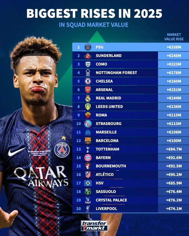 2025年德转身价涨幅最高俱乐部:巴黎涨3.38亿第1,利物浦第20