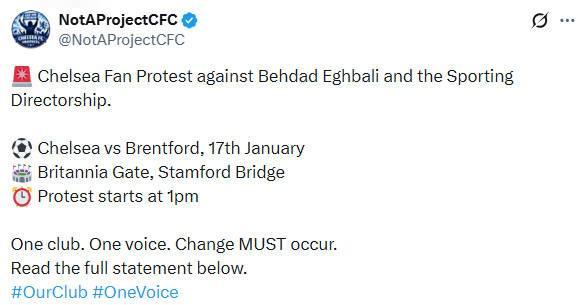 “Not a Project CFC”是一个切尔西球迷组织,他们正在策划即将到来的示威活动,该活动定于1月17日切尔西对阵布伦特福德的比赛前在球场举行。