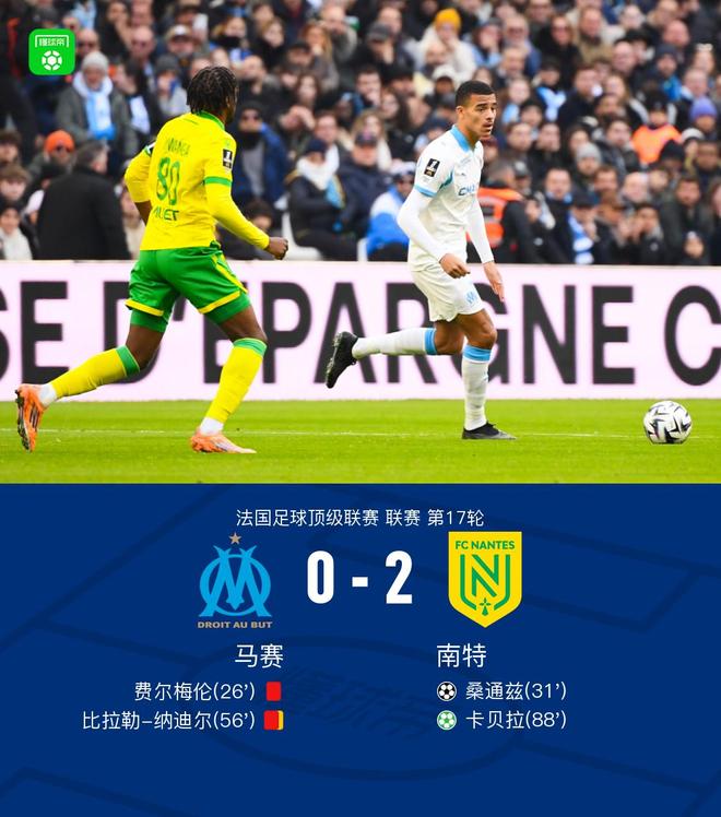 北京时间1月4日法甲日报22:00,法甲第17轮,马赛坐镇主场迎战南特。上半场,费尔梅伦染红离场,随后南特抓住机会,桑通兹冷静施射破门,帮助球队取得领先。下半场,马赛再少一人作战创,比拉勒-纳迪尔累积两张黄牌被罚离场。临近终场,南特获得点球机会,卡贝拉主罚命中。最终马赛0-2不敌南特。