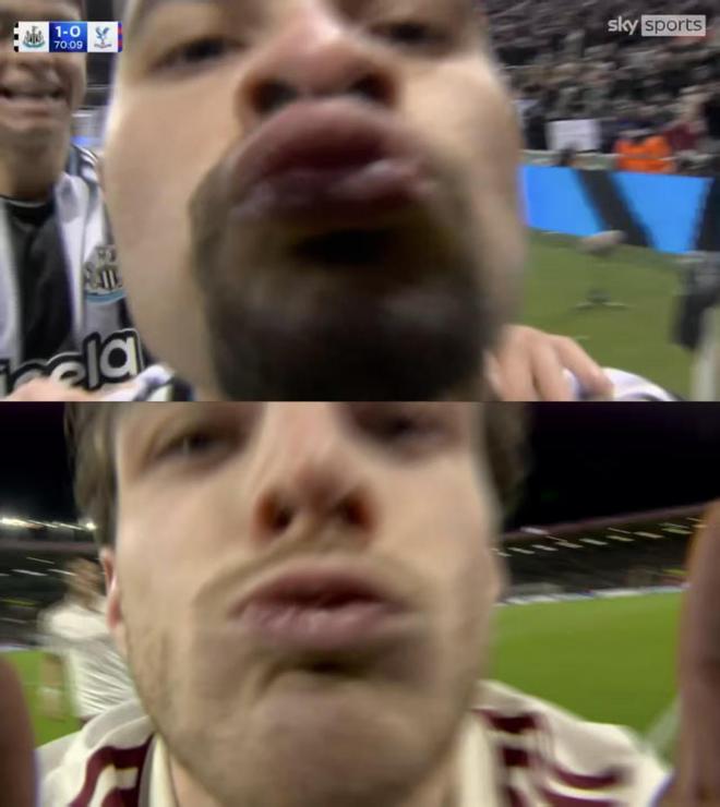 在纽卡vs水晶宫同样的比赛第71分钟,吉马良斯头球破门帮助纽卡取得领先,随后他也亲吻镜头庆祝。