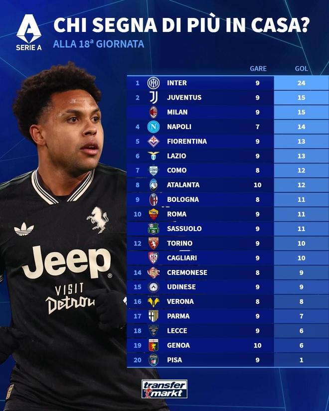 本赛季意甲主场进球榜:国米24球断档领先,尤文、米兰15球第2
