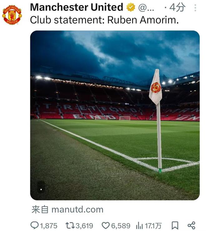 北京时间1月5日英超日报,曼联在社交网站上发布声明宣布,解雇现任主帅鲁本·阿莫林。