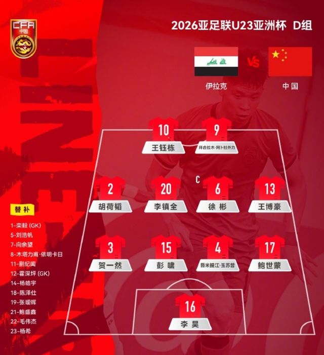 随后,中国U23比赛开始,首发阵容排出442阵型,胡荷韬去到左前卫位置。具体为:门将李昊,贺一然和鲍世蒙打两个边后卫,彭啸、吾米提江·玉苏普组成双中卫。前卫线:胡荷韬和王博豪打两个边前卫,李镇全、徐彬组成双后腰。锋线是拜合拉木、王钰栋。