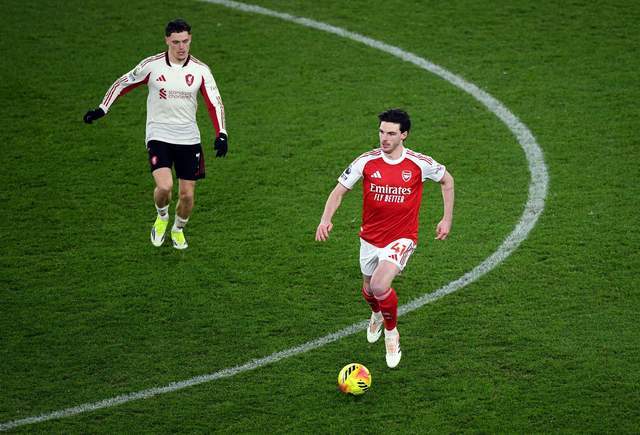 由于曼城本轮率先出战并且失分,阿森纳只要获胜就能继续扩大领先优势,本场比赛枪手沿用433阵型,哲凯赖什、特罗萨德和萨卡搭档三叉戟,赖斯、苏维门迪和厄德高坐镇中场,萨利巴和加布里埃尔统领后防线。