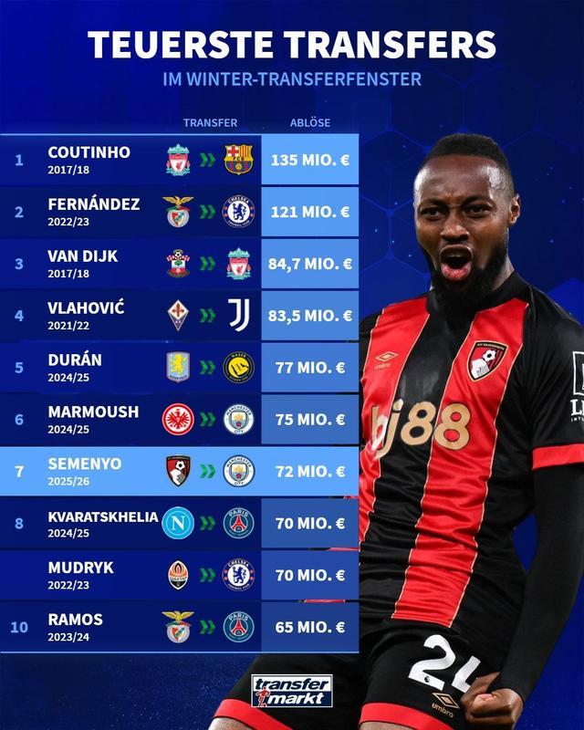 北京时间1月9日英超日报,曼城俱乐部官方发布公告,宣布从伯恩茅斯签下塞门约,根据此前的报道,这笔交易的固定费用为6250万英镑(约7200万欧),随后,德国转会市场列举了历史冬窗最贵交易排行榜。