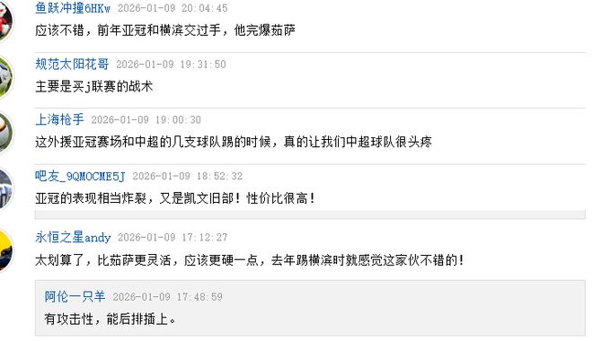 有球迷表示,才37.5万欧,中超保级队外援都不止这个身价了吧,这个年纪这个身价来中超第一名当外援,笑死谁呢!也有球迷认同这笔交易,评论区有球迷表示前年海港跟横滨水手交过手时,他完爆茹萨。也有人指出他的亚冠表现相当炸裂,真的让中超球队很头疼,性价比很高。