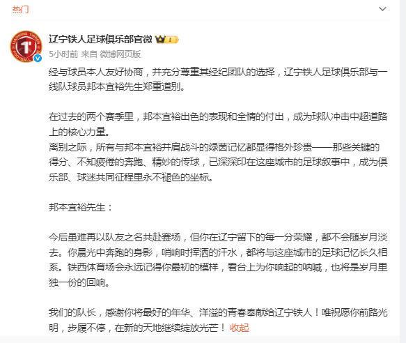 1月9日,辽宁铁人官宣,队长邦本宜裕离队。值得一提的是,此前延边龙鼎俱乐部先官宣了邦本宜裕加盟。辽宁铁人俱乐部表示:经与球员本人友好协商,并充分尊重其经纪团队的选择,与一线队球员邦本宜裕先生郑重道别。“我们的队长,感谢你将最好的年华、洋溢的青春奉献给辽宁铁人!唯祝愿你前路光明,步履不停,在新的天地继续绽放光芒!”
