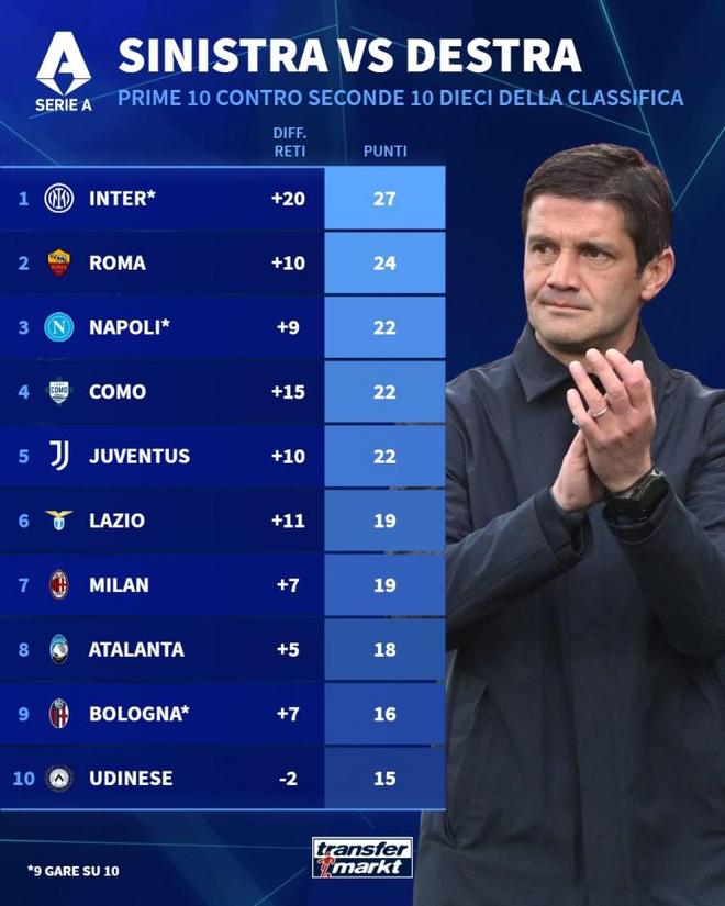 为何在本轮能够拉大与AC米兰和那不勒斯的分差呢?齐沃治下的国米靠的就是稳定的虐菜能力!口说无凭,我们上数据!根据德国转会市场统计,意甲排名前十球队对阵下半区球队的战绩如下,国米除了1场与莱切的补赛还没打之外,其他9场比赛全胜拿到27分,得分率高达100%!罗马10场比赛拿到24分,得分率80%;那不勒斯9场比赛拿到22分,得分率76%;尤文10场比赛拿到22分,得分率为73%;而米兰10场比赛只拿到19分,得分率只有可怜的63%。
