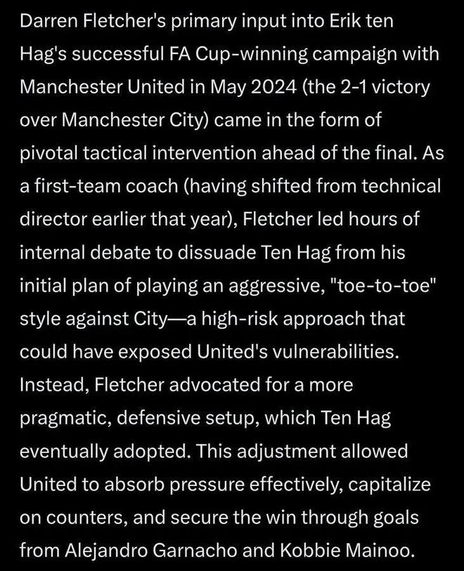 「竞技网」的报道甚至回顾到滕哈格带队夺取足总杯决赛的时候,称当时的防守反击战术出自弗莱彻的提议。