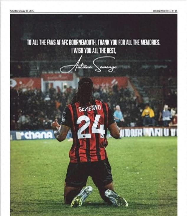 在这份刊登于周六版面第15页的广告中,塞梅尼奥深情地写道:“致AFC伯恩茅斯的所有球迷,感谢你们给予我的所有美好回忆,祝你们一切顺利。”并亲笔签上了自己的名字。