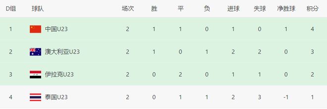2轮过后,中国U23队1胜1平积4分,位居D组榜首;澳大利亚U23队1胜1负积3分,位居次席;伊拉克U23队2平积2分,排名第3;泰国U23队1平1负积1分垫底。从中可以看出,这4支球队的积分形成了等差数列。这意味着谁都有出线机会,也都有被淘汰可能,该组出线悬念将延续到最后一轮。