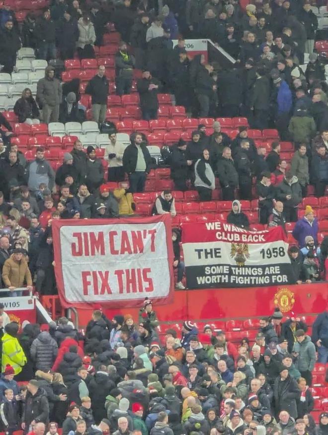 看台上,球迷的横幅刺痛了每一个红魔拥趸的心:“吉米(拉特克利夫),解决不了这个”、“我们想要回我们的俱乐部”。
