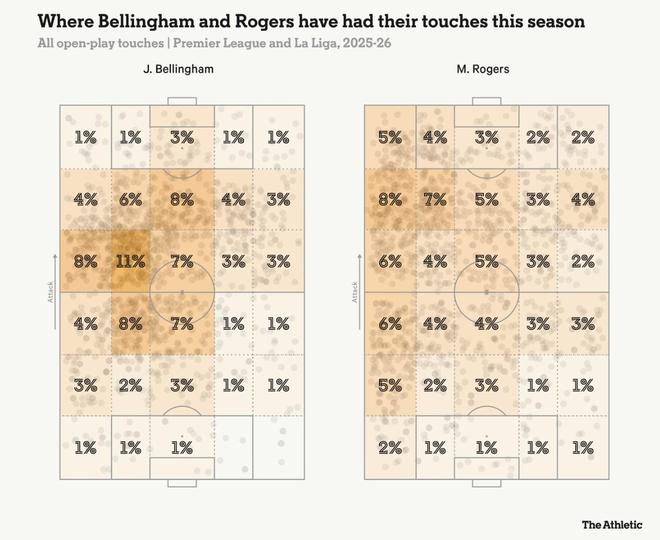 贝林厄姆尚未找回他在2023-24赛季的进攻巅峰状态——当时他在28场西甲比赛中打进19球。上赛季他仅有9球入账,本赛季至今也只有4球,不过这其中存在一些客观因素。他因肩伤恢复而推迟开启赛季,同时从下方触球热区图可以看出,他承担了比罗杰斯更多的防守任务,在进攻三区的触球比例低了11个百分点。