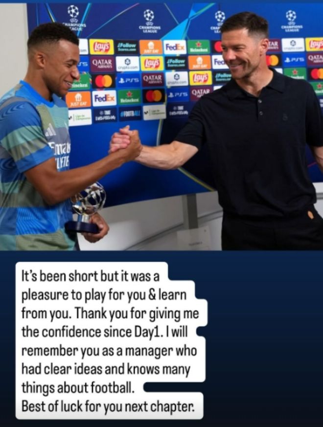 01月13日讯 皇马官宣阿隆索下课,姆巴佩在社媒发表动态与阿隆索告别。