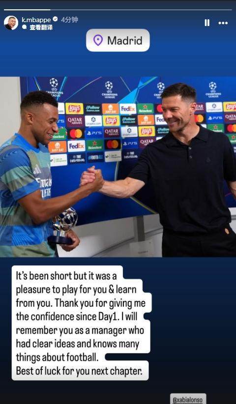 皇马球员首发声!姆巴佩告别阿隆索:为您效力很荣幸