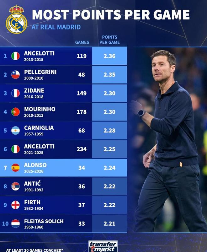 皇马队史执教至少30场主帅场均积分榜:阿隆索2.24分第7