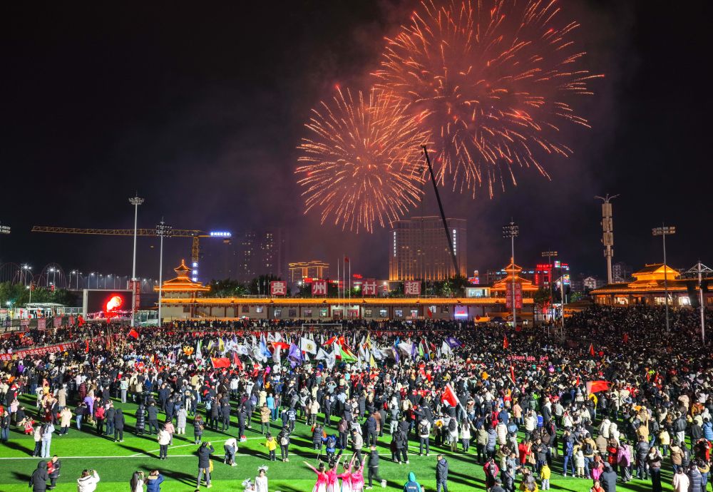 1月2日,人们在活动现场观看烟花表演(无人机照片)。当日,第四届贵州“村超”开幕式暨“村超村晚”活动在榕江县举行。足球日报记者 杨文斌 摄