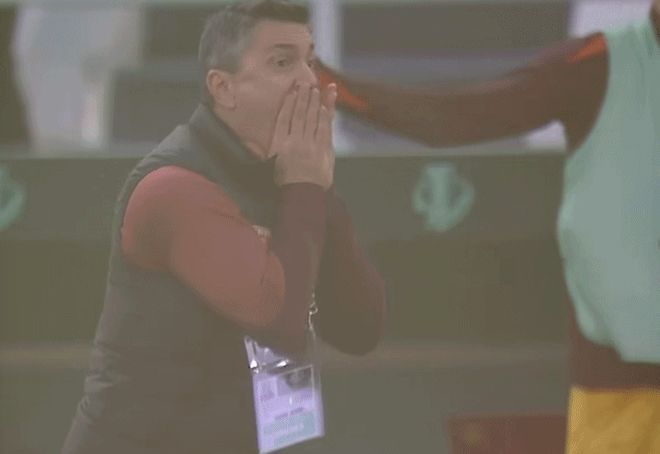 如此离谱的失误,让安东尼奥非常不满,双手捂脸,助教们也集体抗议。然而,主裁判却跑到边线,向助教出示了黄牌。