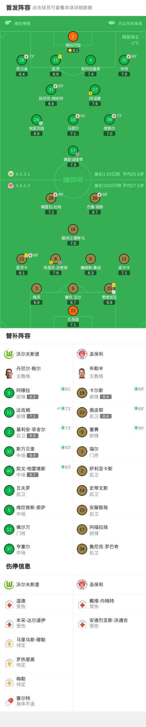 沃尔夫斯堡2-1圣保利,佩契诺维奇破门,埃里克森点射