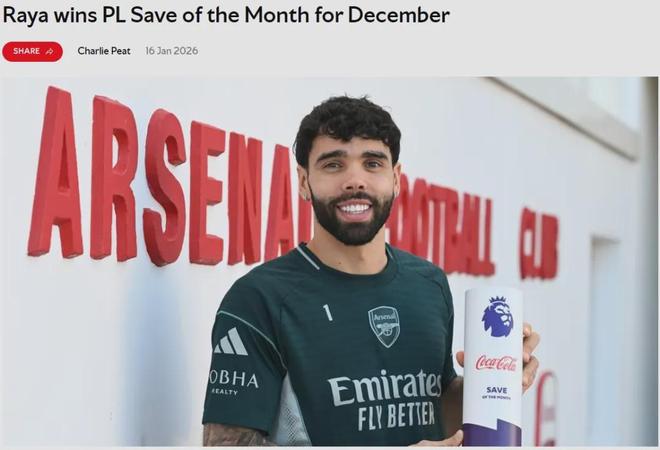 官方:拉亚在阿森纳2-1战胜布莱顿一役中的扑救被评为了英超12月份最佳扑救。