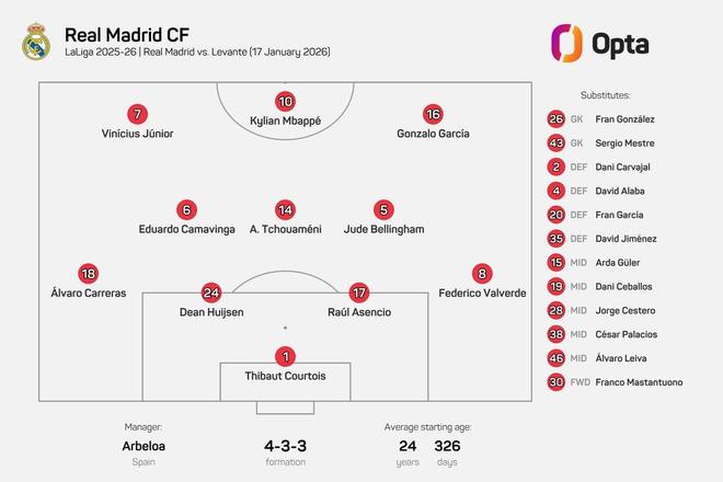 据Opta统计,阿韦洛亚排出了一套平均年龄为24岁326天的首发阵容,这是自至少2003-04赛季以来,皇家马德里主教练在西甲首秀中使用的最年轻首发阵容,超过了穆里尼奥在2010年对阵马略卡时创下的纪录(25岁181天)。