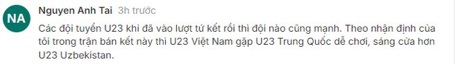 越南球迷是怎么看待这场比赛的呢?有球迷在评论区表示,虽然进入四分之一决赛阶段后,所有U23队伍都很强大,但在这场半决赛中,相比乌兹别克斯坦U23,中国U23会更容易对付,出线前景更明朗(下图)。