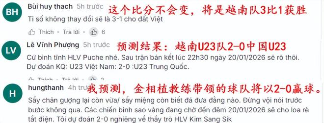 评论区绝大部分球迷都看好越南队,其中不少人预测比分都是越南队赢2球(下图),有说是3比1,还有2比0,总之都是U23国足输球被淘汰。