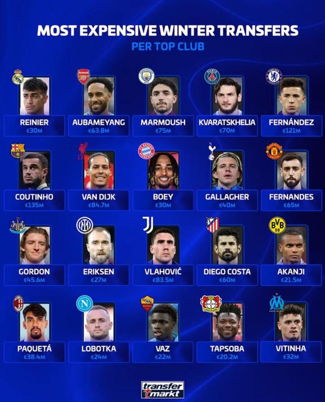 德转列五大联赛20大俱乐部冬窗最贵引援:巴萨1.35亿签库鸟第1