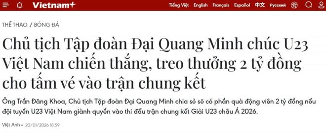这两家越南企业分别是大光明集团及TV360平台,两家企业都宣布:如果越南U23男足能够击败中国队进入决赛,将分别奖励球队20亿越南盾,共计40亿越南盾。而40亿越南盾,约等于106万元人民币。