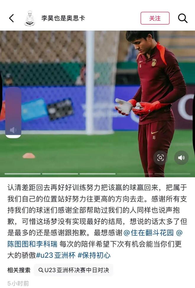 今天(1月25日足球日报),李昊也在社交媒体发文回应:“认清差距回去再好好训练努力把该赢的球赢回来,把属于我们自己的位置站好,努力往更高的方向去走。感谢所有支持我们的球迷们,感谢全部帮助过我们的人,同样也说声抱歉,可惜这场梦没有实现最好的结局,想说的话太多了但是最多的还是感谢跟抱歉,希望下次有机会能当你们更大的骄傲。
