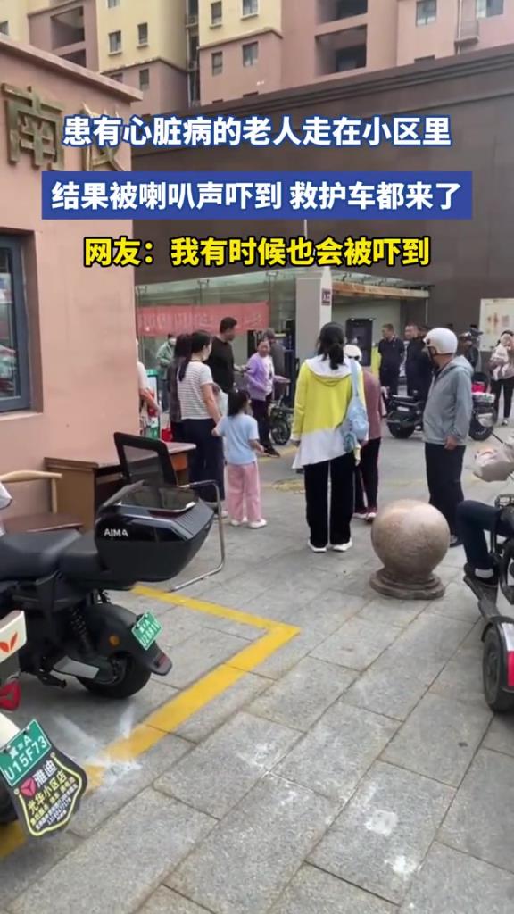 患有心脏病的老人走在小区里,结果被喇叭声吓到,救护车都来了