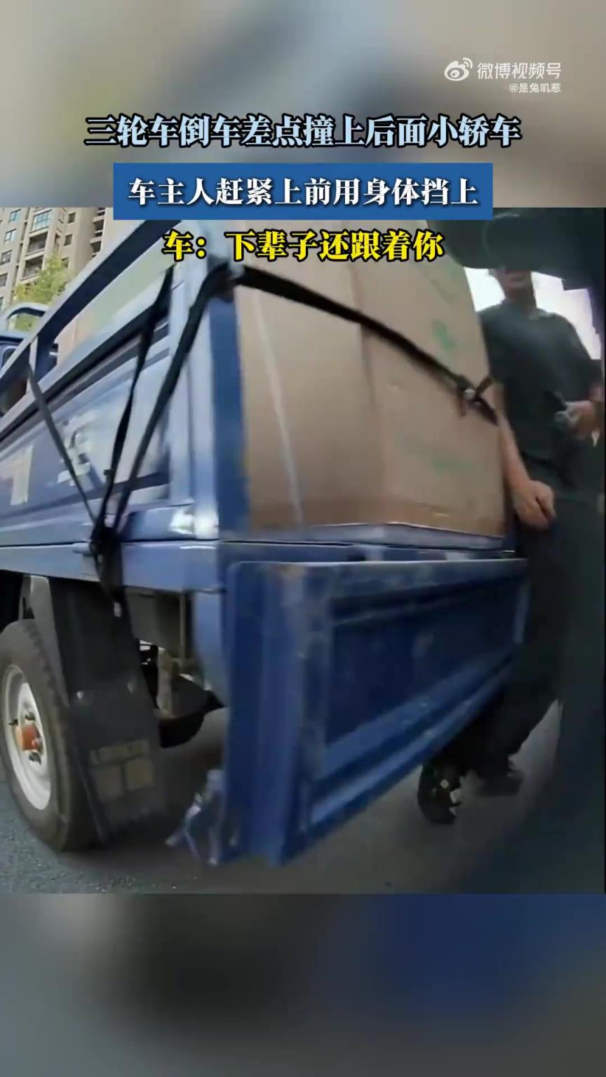 三轮车倒车差点撞上后面小轿车,车主人赶紧上前用身体挡上!