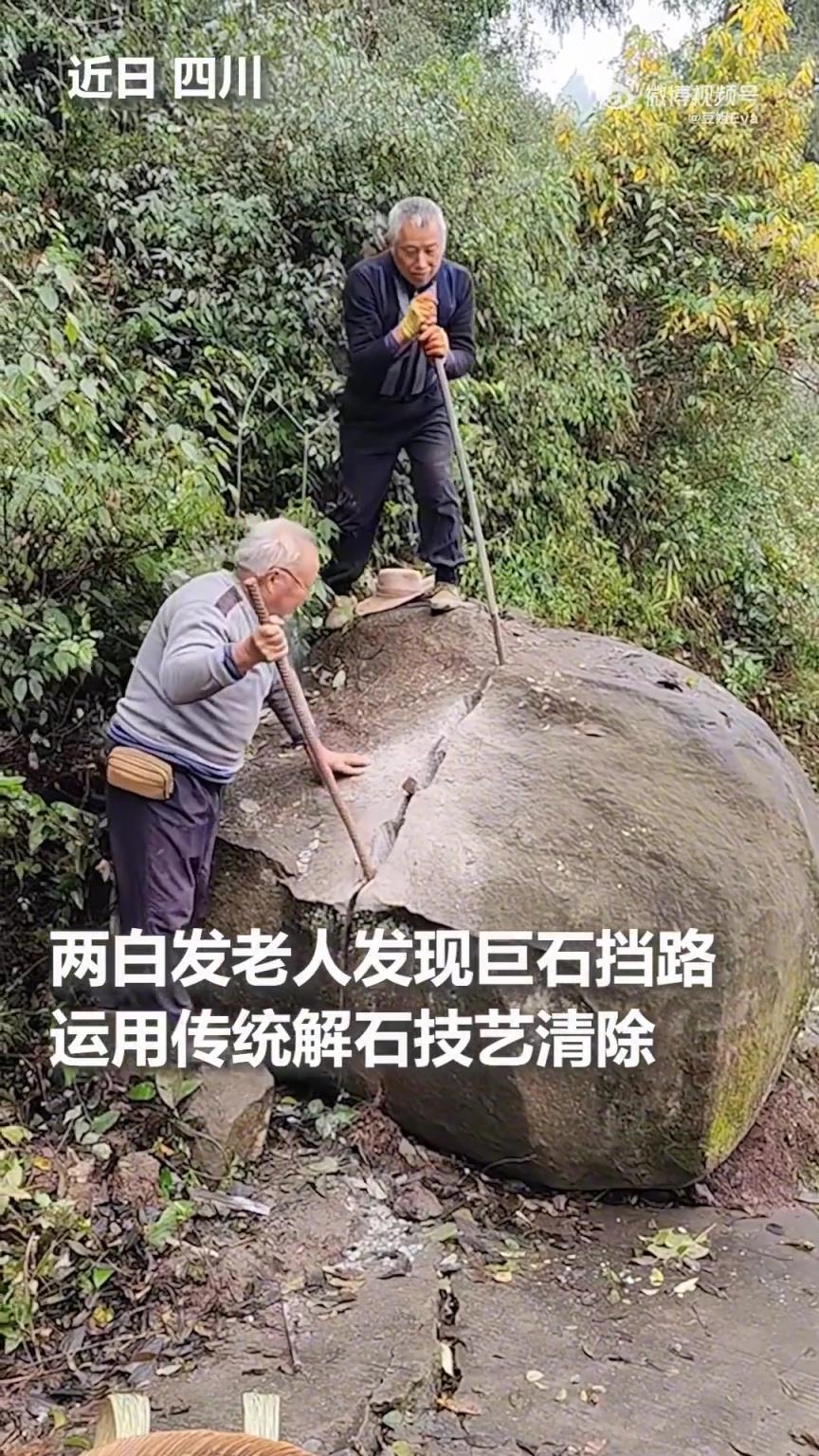 两白发老人用传统技艺清除挡路巨石,似现代“愚公”