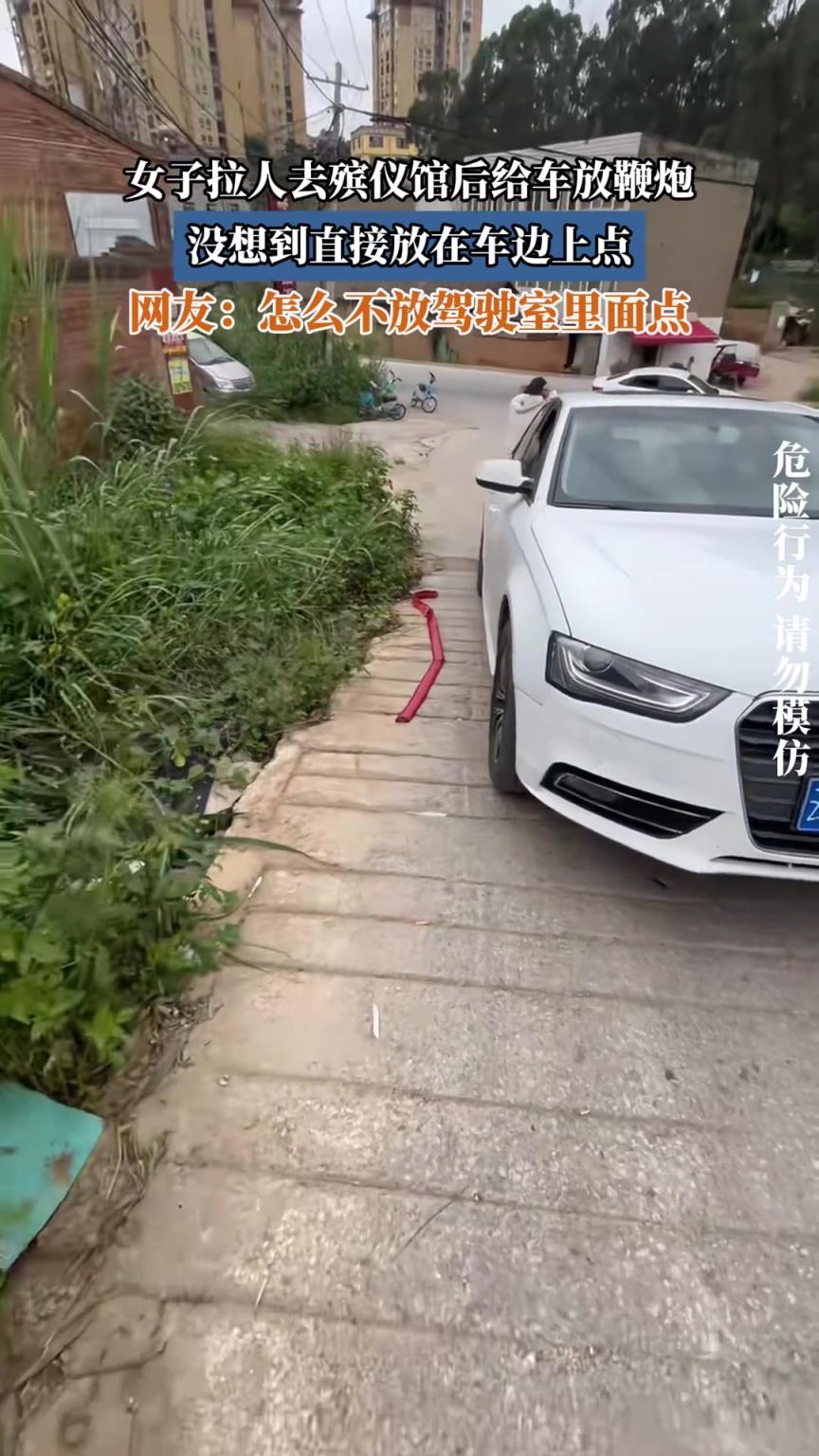 女子拉人去殡仪馆后给车放鞭炮,没想到直接放在车边上点