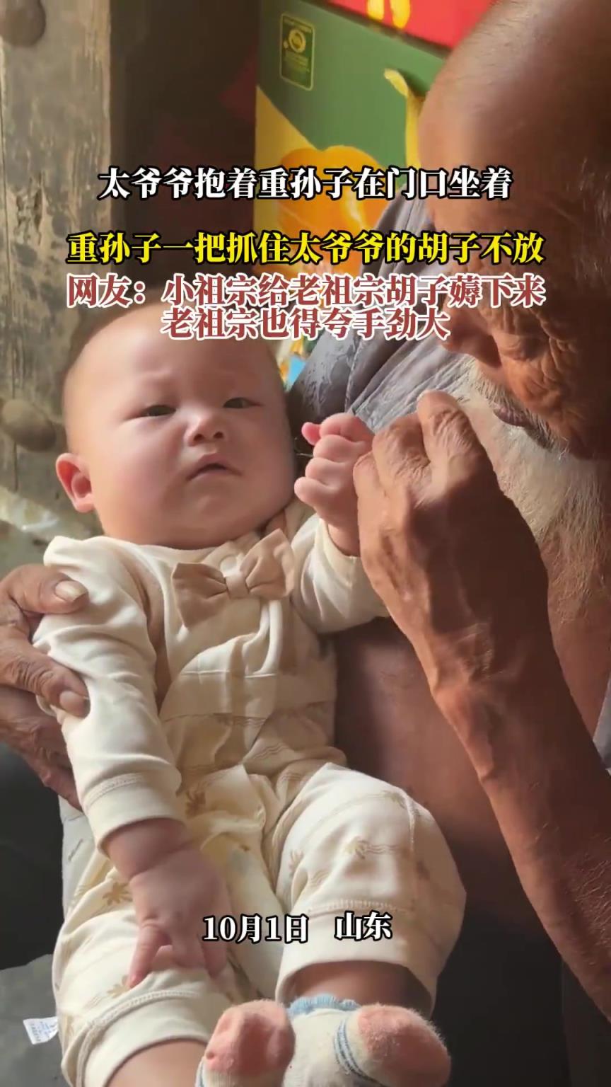 太爷爷抱着重孙子在门口坐着,重孙子一把抓住太爷爷的胡子不放!