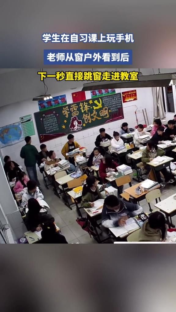 学生在自习课上玩手机,老师从窗户外看到后,直接跳窗走进教室