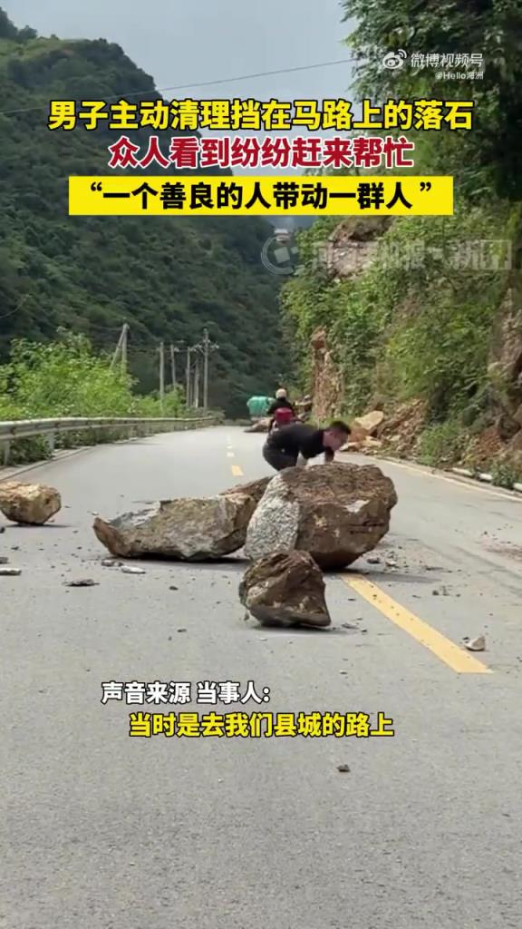 男子主动清理挡在马路上的落石,众人看到纷纷赶来帮忙