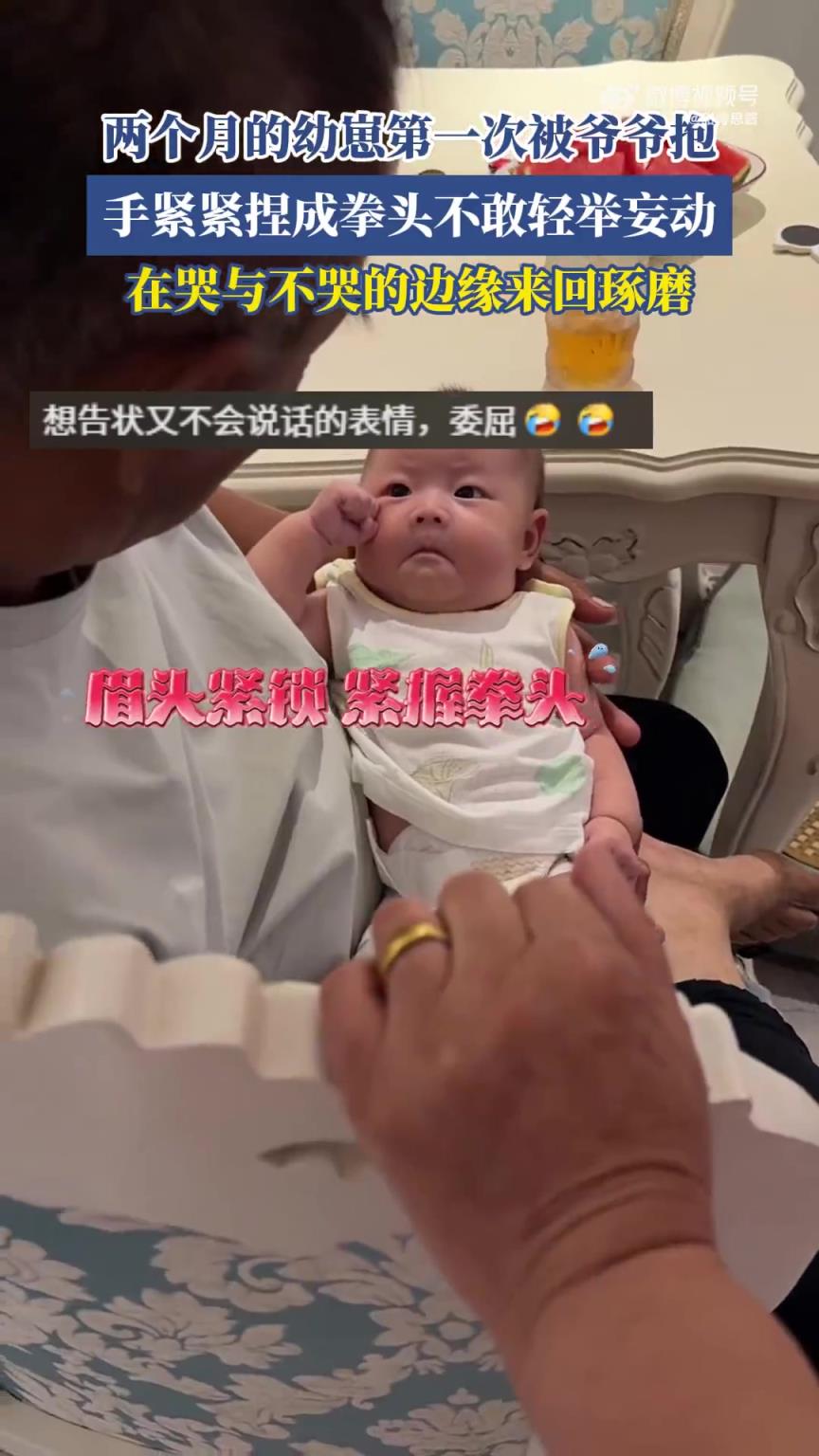 两个月的幼崽第一次被爷爷抱,手紧紧捏成拳头不敢轻举妄动