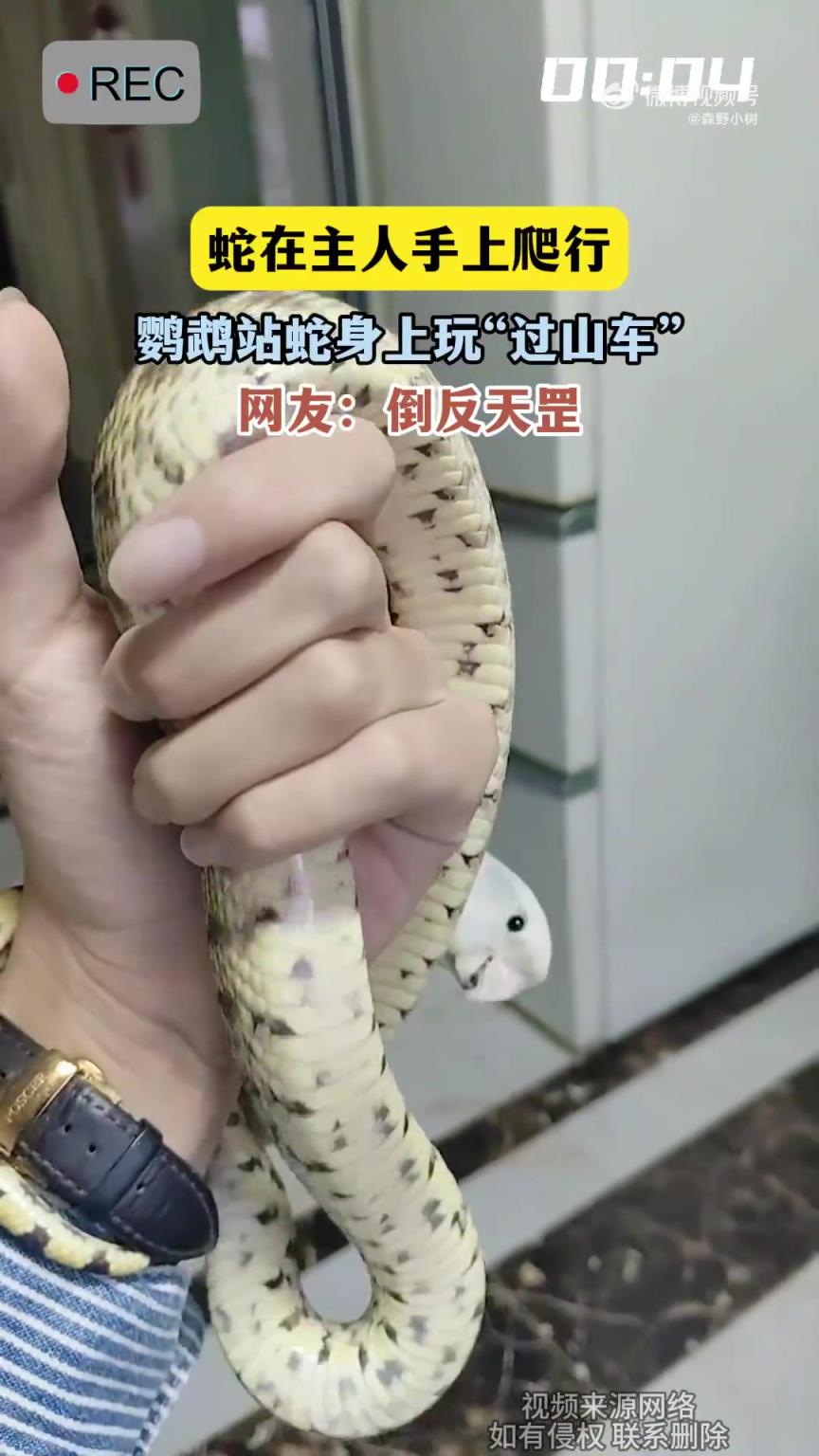 蛇在主人手上爬行,鹦鹉站蛇身上玩“过山车”